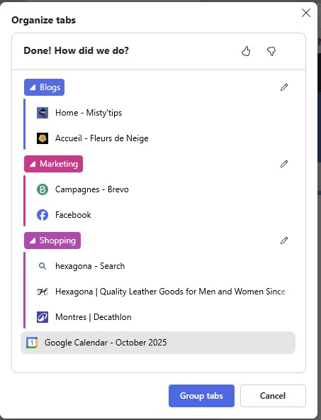Edge analyzes the open pages and offers you a grouping by theme.