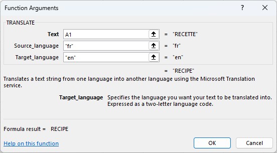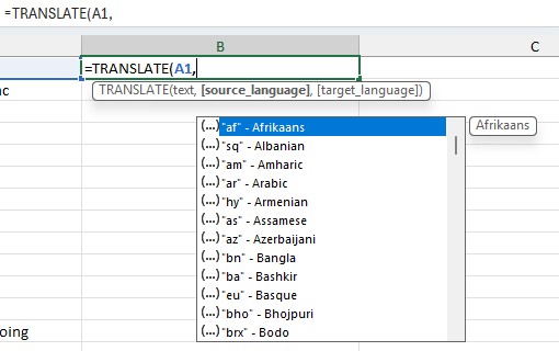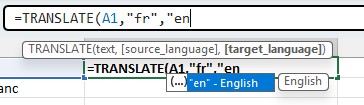 When you type the function in a cell, when entering the arguments Source_language and Target_language, a drop-down list is displayed offering the different language codes.
