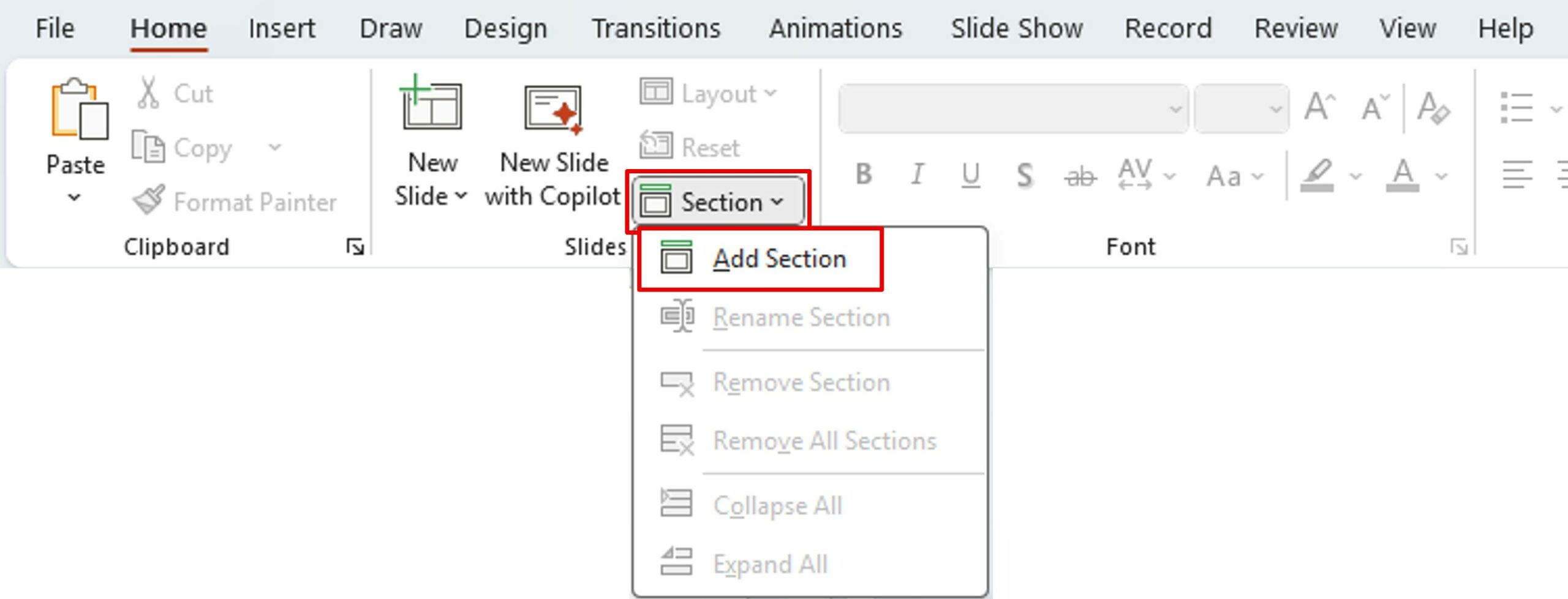 💡Tip: If you double–click the section name, you can collapse (hide all slides) or expand (show all slides) the section.