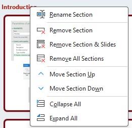- Move section up or down: To reorder the presentation. The whole section moves at once (including slides).