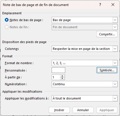 Il est possible de configurer les notes de bas de page. Ainsi dans le menu Références, dans la section Notes de bas de page, cliquez sur la flèche en bas à droite pour ouvrir la page d’options.